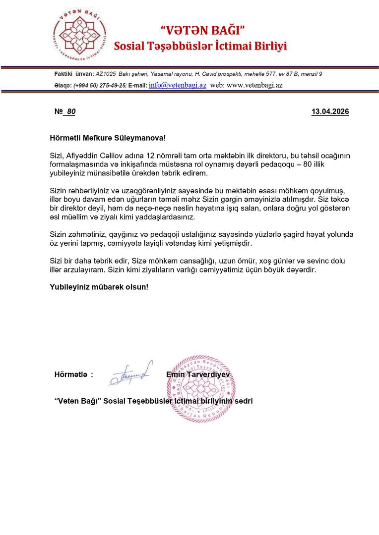 “Vətən Bağı” Sosial Təşəbbüslər İctimai Birliyinin sədri Emin Tarverdiyev vaxtilə təhsil aldığı Naxçıvan şəhər Afiyəddin Cəlilov adına 12 nömrəli tam orta məktəbin ilk direktoru Məfkurə Süleymanovanı 80 illik yubileyi münasibətilə təbrik edib.